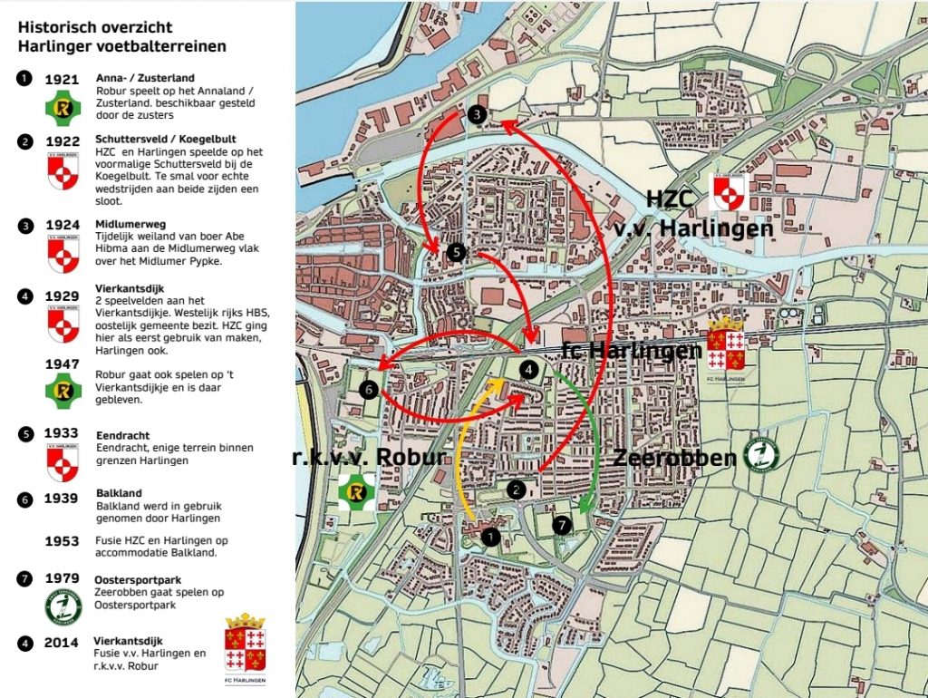 De voetballers van Odio (‘Ons Doel Is Overwinnen!’. voorloper Robur) HZC, Harlingen en Zeemeeuwen, voetbalden overal in de stad. Odio op het Zusterveld (nu Batting), HZC, Harlingen, Zeemeeuwen nabij de Koegelbult en later de Harlinger profs op het driehoekje bij de Bazuin, dus naast de Bildtstraat. Maar ook op een grasveld de zg. Kippenren bij een Visch Rookerij aan de Noorderdijk. Ligt nu midden in de Industriehaven. Het terrein bij de Koegelbult was erg smal met aan beide lange zijden een sloot en menig speler en toeschouwer haalde een nat pak of de speler stond bij ingooi half in de sloot! Het terrein lag op de hoek Grettingalaan en Vierkantsdijk, dus vlak bij het wijkgebouw van de Oosterparkwijk vereniging aan de Oosterparkweg. Er werden daar ook wedstrijden gespeeld en men bracht de doelpalen mee uit de opslag elders in de stad en de belijning werd met zaagsel aangebracht. Af en toe was het lastig om doelpunten te registreren want er waren geen netten! Daar had men het geld niet voor.