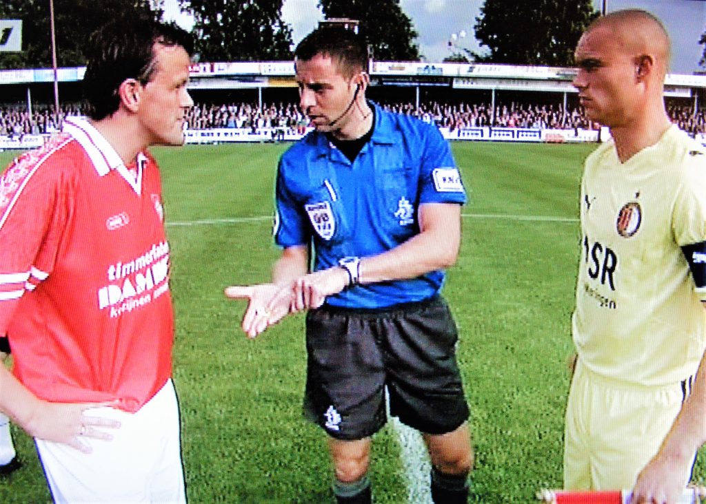 Dat maak je ook maar één keer in je voetbal leven mee: bekeren tegen Feyenoord. Drewes Janssen viel de eer te beurt om met Harkemase Boys, in 2009 tegen het Feyenoord van Mario Been te bekeren op het sportpark het Bosk in Harkema. Op de foto hierboven: v.l.n.r. Aanvoerder Drewes Janssen, Scheidsrechter Pol van Boekel en Feyenoord aanvoerder Kevin Hofland. De Boys verloren het duel met 5 tegen 0, maar daar was de ervaring en beleving van Drewes zeker niet minder om.