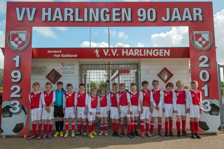Een prachtig plaatje, een van de laatsten op het Balkland, van de jeugd in een erepoort: 90 jaar v.v. Harlingen want het jaar daarop, 2014, komt er een fusie tot stand tussen Robur en Harlingen. Het 90-jarig bestaan werd uitbundig gevierd. De nieuwe fc Harlingen strijkt neer op de Sportcomplex Vierkantsdijk dat is gepimpt tot een prachtige sportaccommodatie inclusief tribune en dus ook helemaal klaar voor de toekomst.